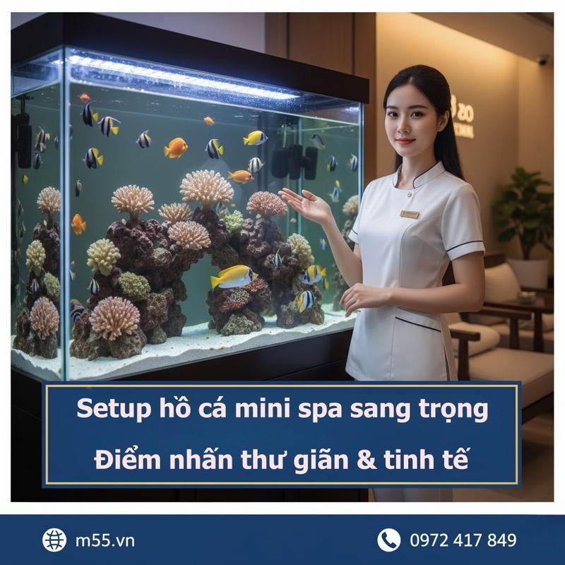 Trong bài viết này, chúng ta sẽ khám phá rõ hơn về lợi ích của việc setup hồ cá mini trong spa, các mẫu hồ cá mini đẹp và phổ biến, quy trình thực hiện từ ý tưởng đến lắp đặt, cũng như giới thiệu dịch vụ của M55 Aquarium – địa chỉ uy tín hàng đầu TP HCM về thủy sinh cảnh.