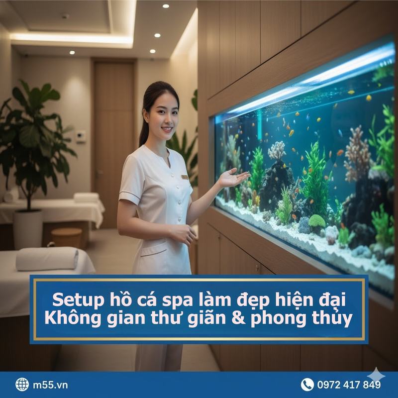 Việc thiết kế và setup hồ cá trong spa không chỉ đơn thuần là trang trí, mà còn là nghệ thuật kết hợp phong thủy, công nghệ và phong cách kiến trúc hiện đại nhằm tạo ra không gian vừa hợp mắt, vừa tích tụ năng lượng tích cực. Theo đó, bài viết này sẽ cung cấp cho bạn cái nhìn toàn diện, từ lý do nên setup hồ cá, các kiểu dáng phù hợp, quy trình thi công, đến địa chỉ uy tín tại TP.HCM – M55 Aquarium.