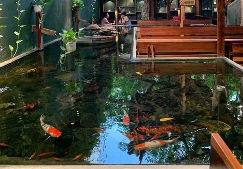 Hồ cá koi mini thường được thiết kế với quy mô nhỏ nhưng mang phong cách trang trí tối giản, sang trọng. Chất liệu hồ cao cấp như kính trong suốt, đá tự nhiên, gỗ mỹ thuật, kết hợp hệ thống lọc nước hiện đại, đem lại hiệu ứng thị giác tinh tế. Các chủ quán có thể lựa chọn bố trí hồ cá koi ở vị trí trung tâm của quán hoặc phía lối đi chính để tạo ấn tượng đẳng cấp đầu tiên khi khách bước vào.